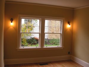 A striking brick chimney and a paved driveway leading to a detached garage enhance the home's functional and aesthetic appeal. The large, multipaned windows invite natural light into the interior, emphasizing the Craftsman focus on creating bright, livable spaces. This home exemplifies the kind of high-quality renovation and restoration work Complete Construction is known for, preserving historic charm while integrating modern elements to meet contemporary needs. It's a perfect example of how Complete Construction transforms classic Portland homes into updated yet timeless treasures.